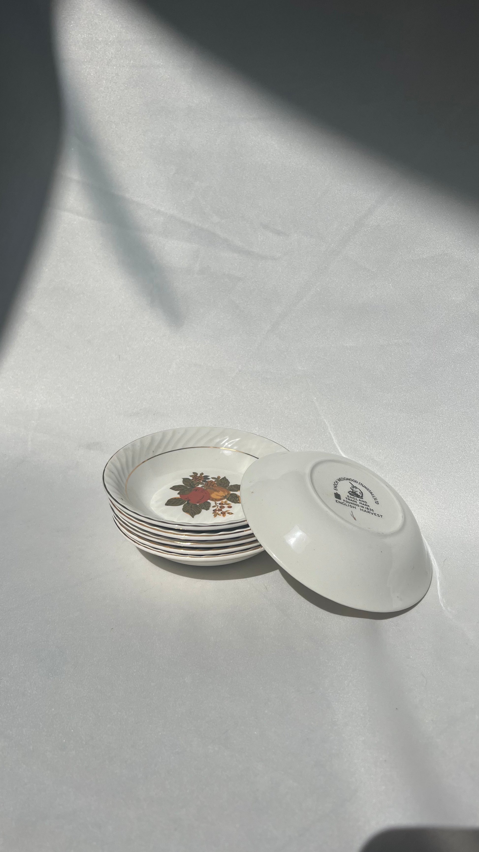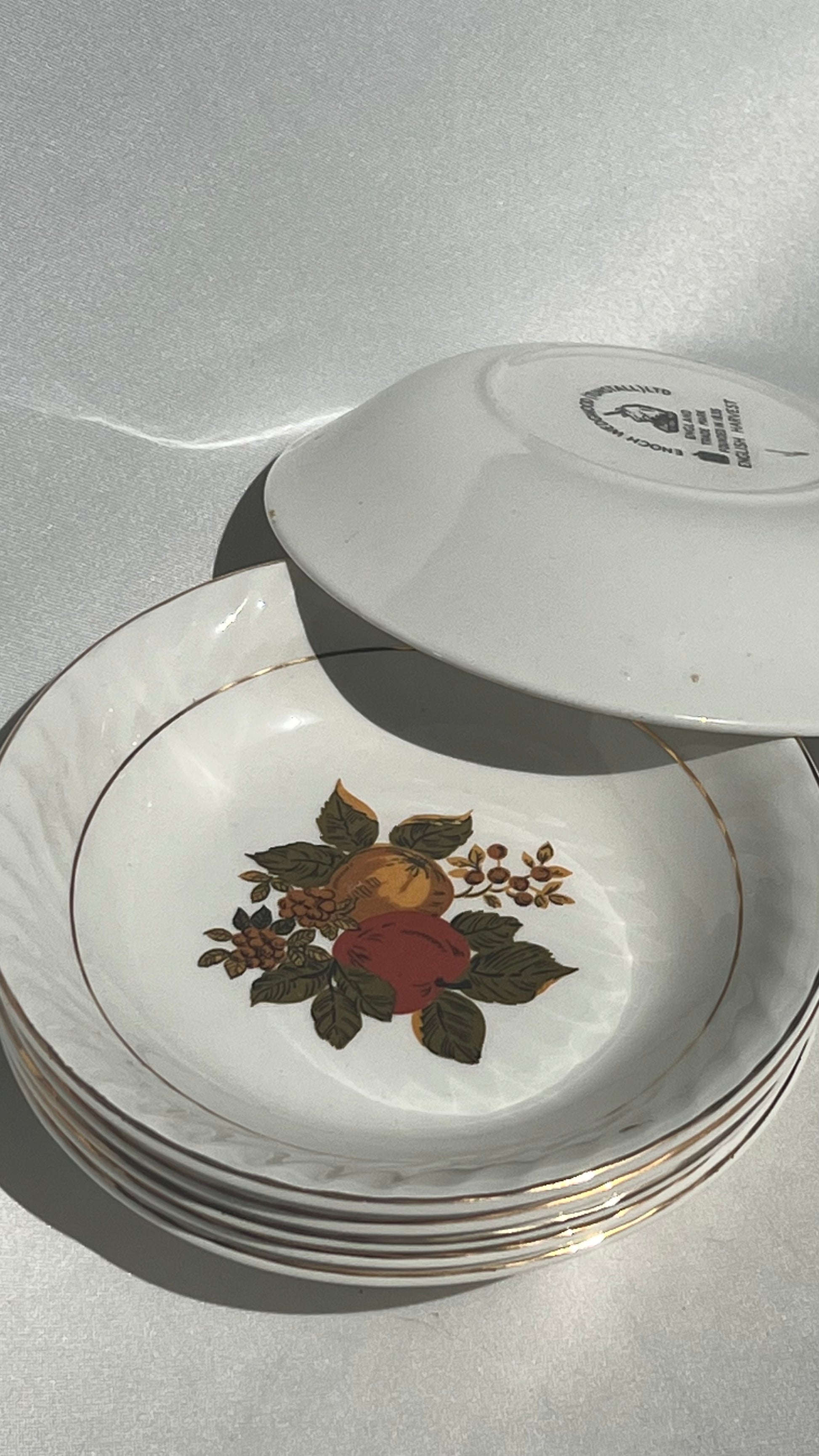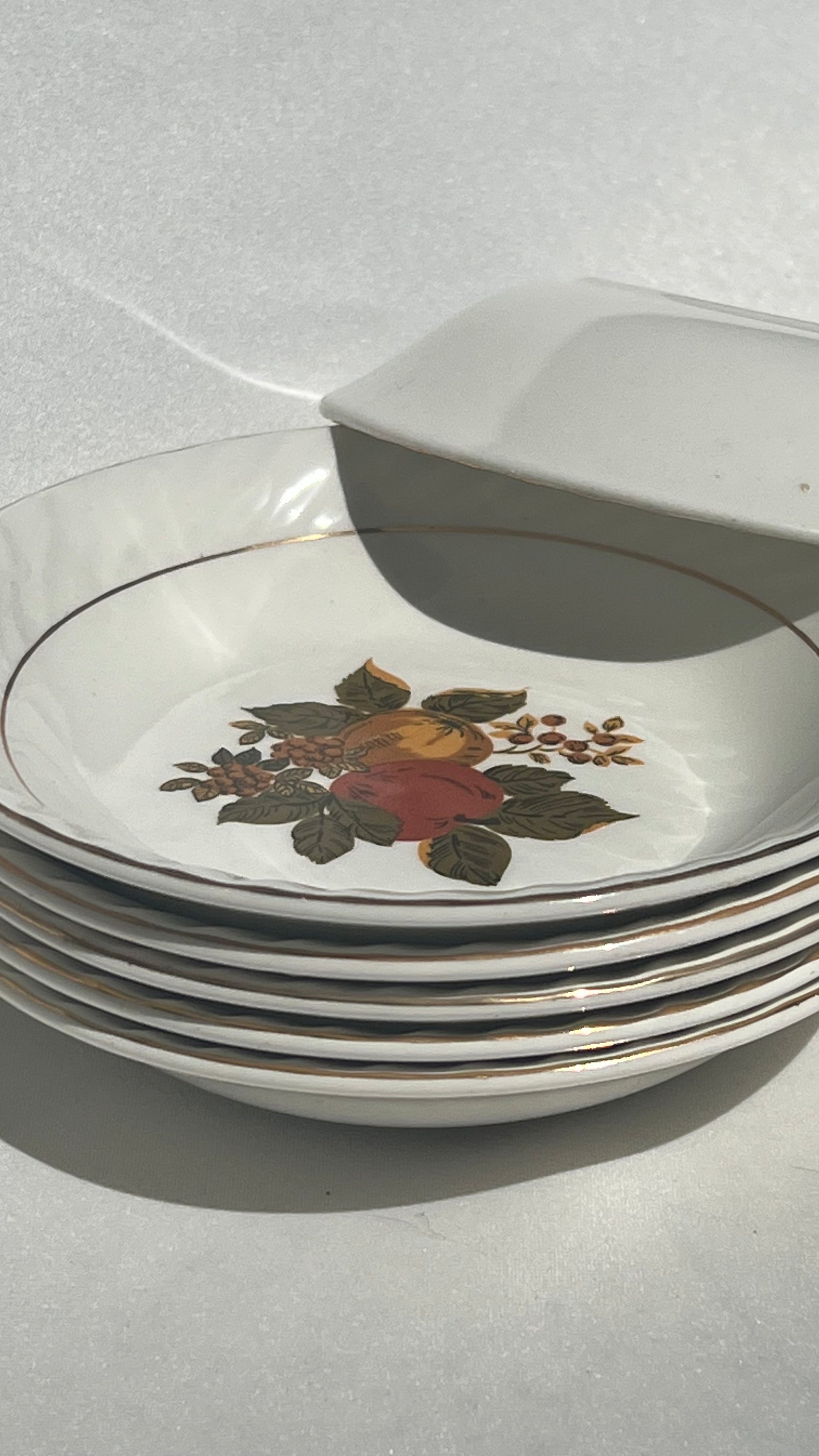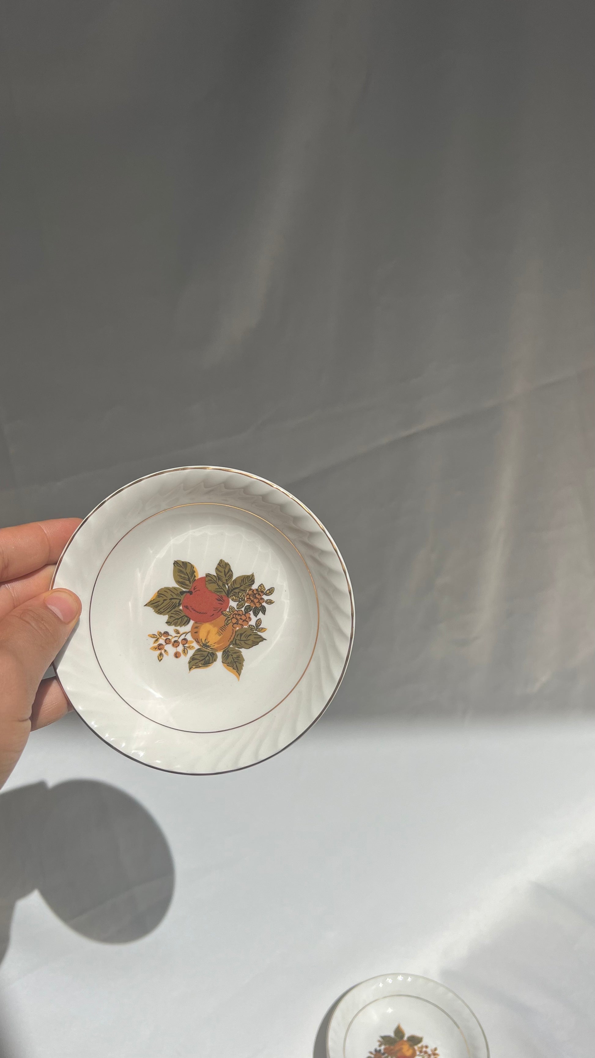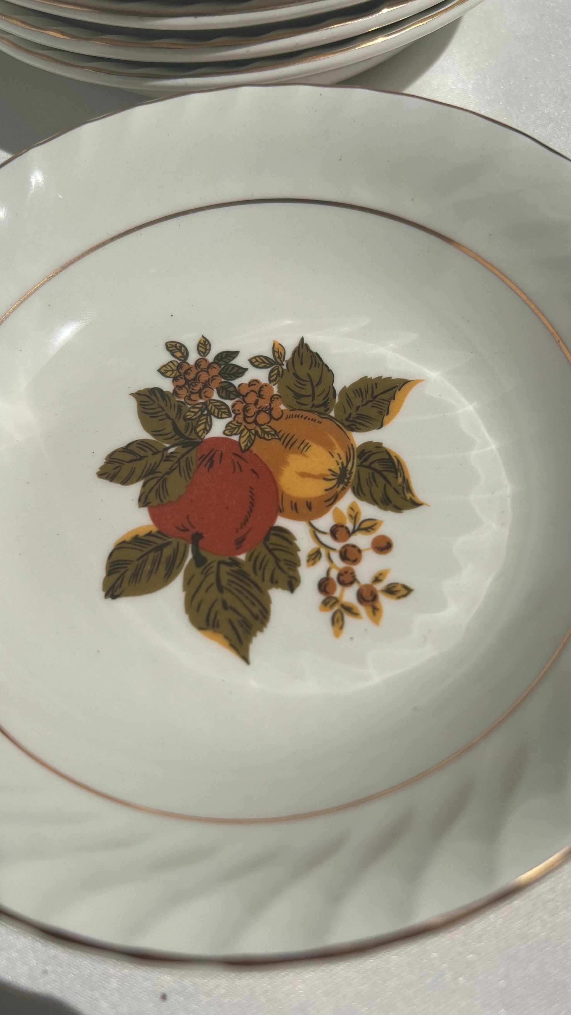 ציור אביבי פירותי בעלי קימור גלי ומיוחד לפנים הקערה ושני פסי זהב תוחמים